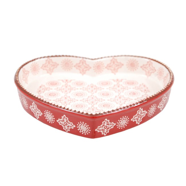 Die Form ist aus Keramik und hat von innen und außen ein Muster in rot/weiß. Da das Muster von Hand gedruckt wurde, kann es zu leichten Unterschieden im Muster kommen.